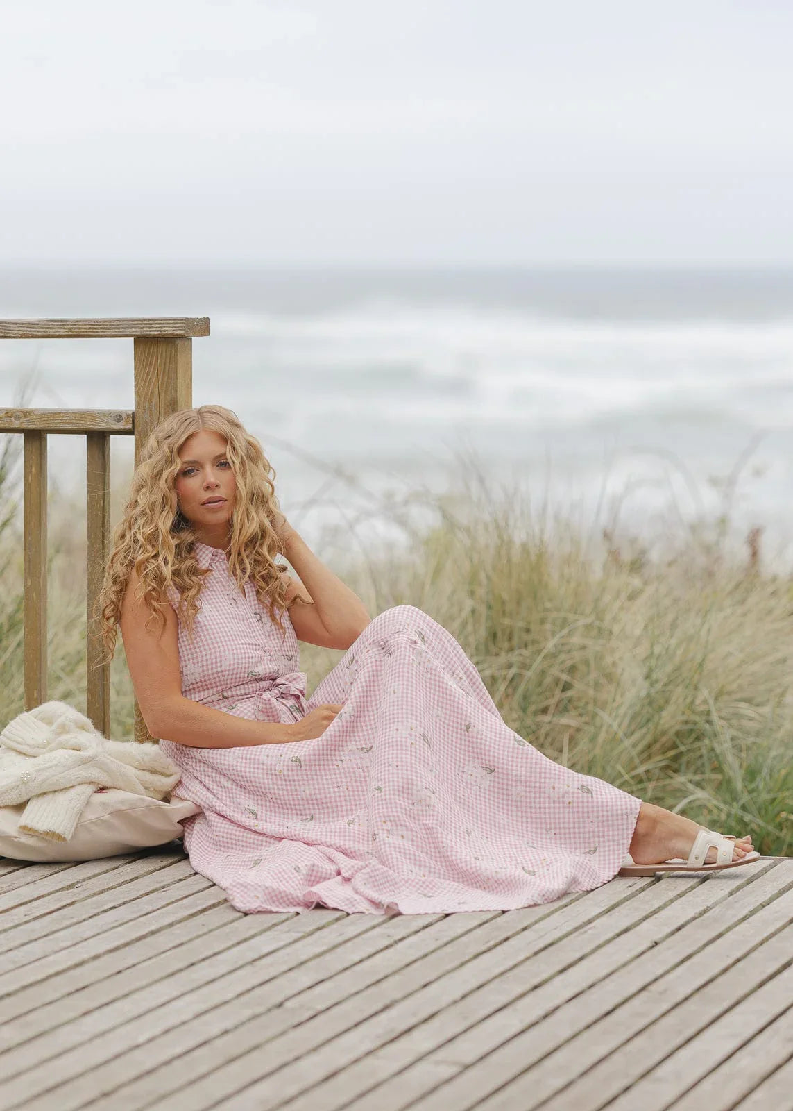 The Bailey Dress is a charming blend of classic gingham and delicate florals, made for sweet summer moments. Featuring a collared neckline, functional buttons down the front, and a bow-tied waist, it adds just the right touch of vintage flair. The soft pink hue and flowy silhouette make it a picture-perfect pick for garden parties, picnics, or casual strolls. Feminine, fresh, and effortlessly timeless.