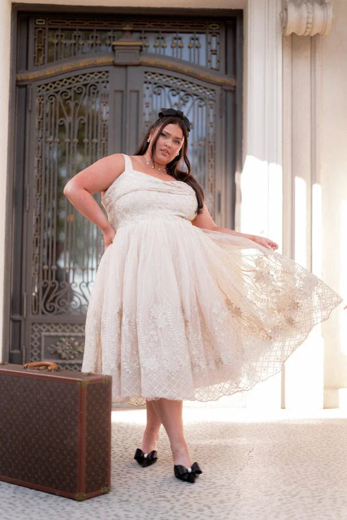 Be the star of the show in our Brigette Dress – a vision of royal elegance that will transport you to a world of festive wonder. As you slip into this golden beauty, you'll find yourself immersed in a dreamy holiday fantasy, where every moment shimmers with magic. Pair it with pearls and heels to complete a look that's timelessly chic and beautifully you.