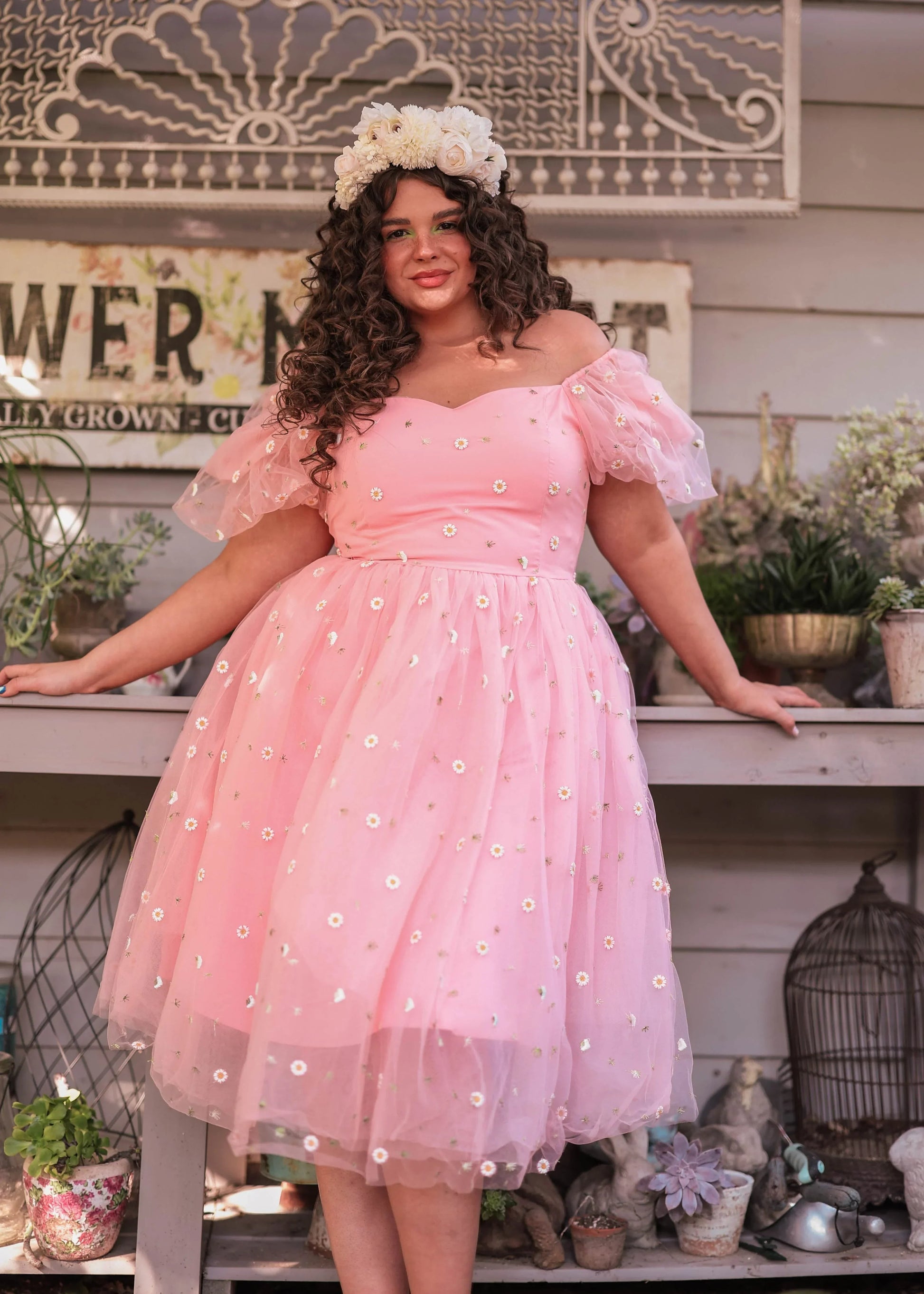 Introducing our enchanting Faye Dress, a mesmerizing creation that embodies the ethereal essence of our Fairy Collection. Crafted from the softest blush-pink fabric, this dress transports you to a whimsical realm of dreams with delicate white daisies scattered across its airy design. Perfect for a summer picnic, brunch with the girls, or a romantic garden.