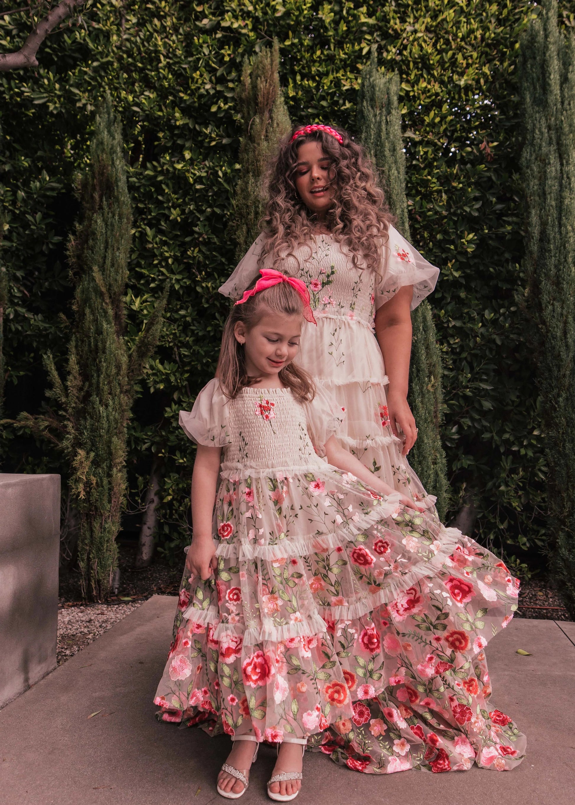 This darling girl's dress can be worn to match or worn on its own. Features a matching pink rose print to the Mommy + Me style with a smocked bodice, square neckline, and elastic puff sleeves. Fully lined.